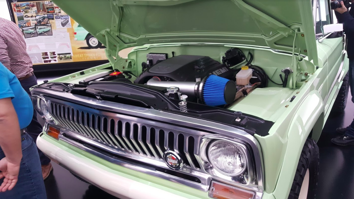 The old Rhino grill has been removed, replaced with a razor grill. It’s not traditional, but it looks damn good. Behind this grille, there’s something even less traditional, and even more interesting. The original’s powertrain has been replaced with one from a Dodge Ram, with a 5.7 liter Hemi V8 hooked up to a four-speed auto transmission. There’s power steering too, from a JK model Wrangler, and the frame has been boxed.