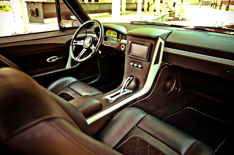 Inside, just as many changes have been made. New aluminum panels have been hand made, and the cabin is bedecked in leather, complete with suede inserts. Add to this Dakota Digital gauges and a new center console, and you have a thoroughly modern restomod.