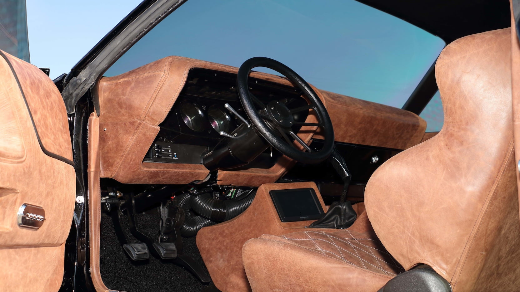 So, as well as 707 horsepower, what else does this restomod pack? Well, the radiator has also seen an upgrade, and the engine has been hooked to a Tremec six-speed with a pistol shifter. As well as that, the car’s underbelly has seen a thorough modernization, with coilover shocks and disc brakes installed. This dark destroyer has been entirely blacked out too. The headlights have been updated, and a T/A hood scoop and rear spoiler have been fitted, but it still looks vintage. The interior, likewise, retains its old charm, but has been redone in tan leather and updated with a touchscreen in the center console. Packing a modern punch, looking like a villain’s car from some campy 70s horror movie, and just as charming as the original, this is absolutely a restomod done right.