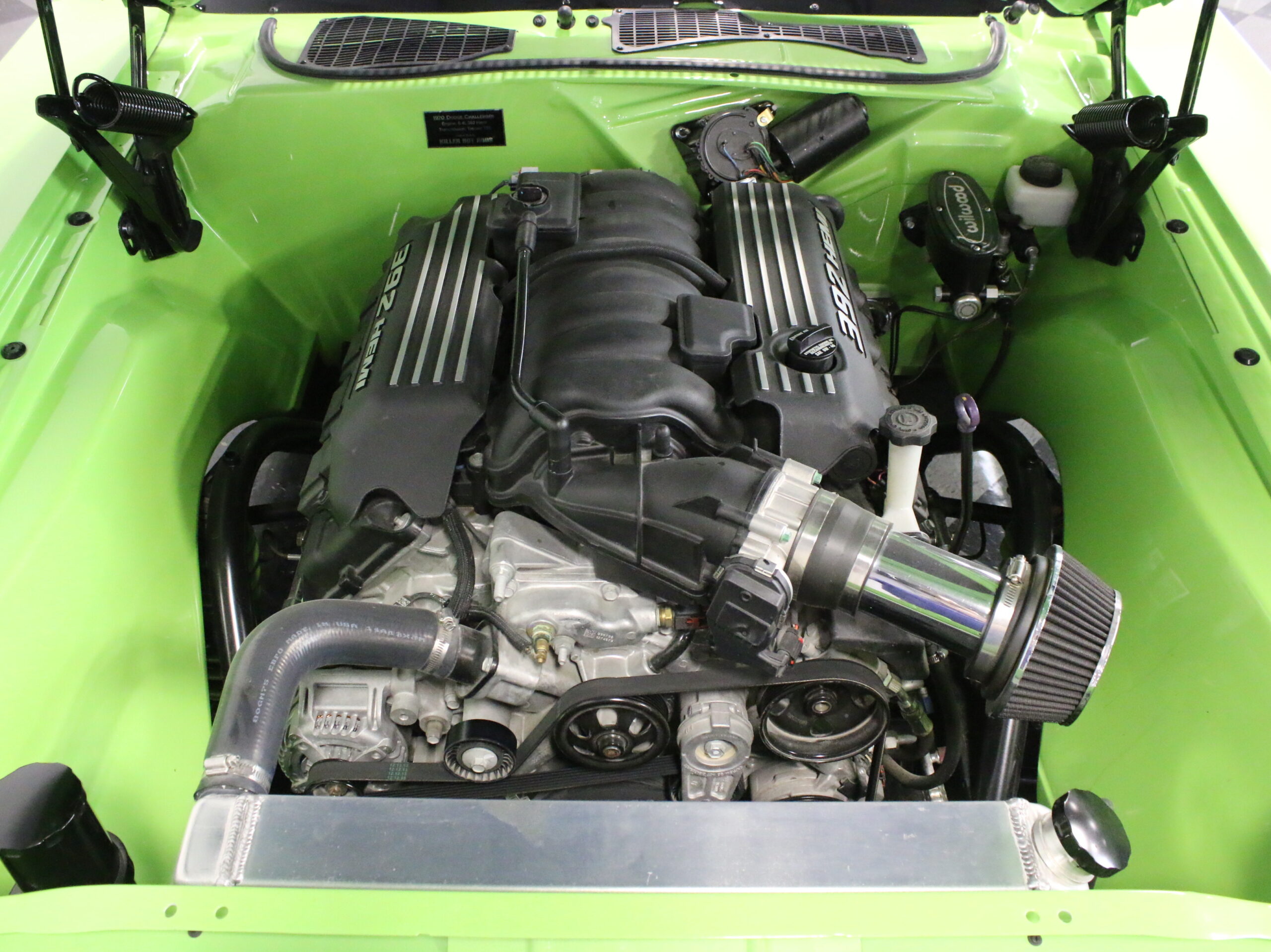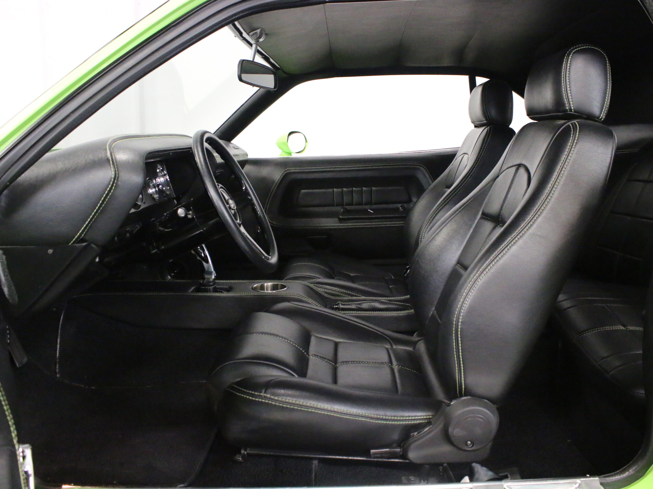 There’s something about Chargers and Challengers that make usually unpleasant car colors look gorgeous. This Sublime Green color scheme, complete with blacked out grille, rear spoiler, and rims really makes this car’s style pop. The interior has seen new leather bucket seats fitted, with the center console also being reupholstered in hide. Auto Meter gauges peep out from behind the three-spoke wheel, a new audio head with iPod hookup sits in the radio slot, and a pistol grip shifter beckons you to drive it at speed. Even the trunk hasn’t gone unchanged, with new bulkheads fitted to contain the new hardware.