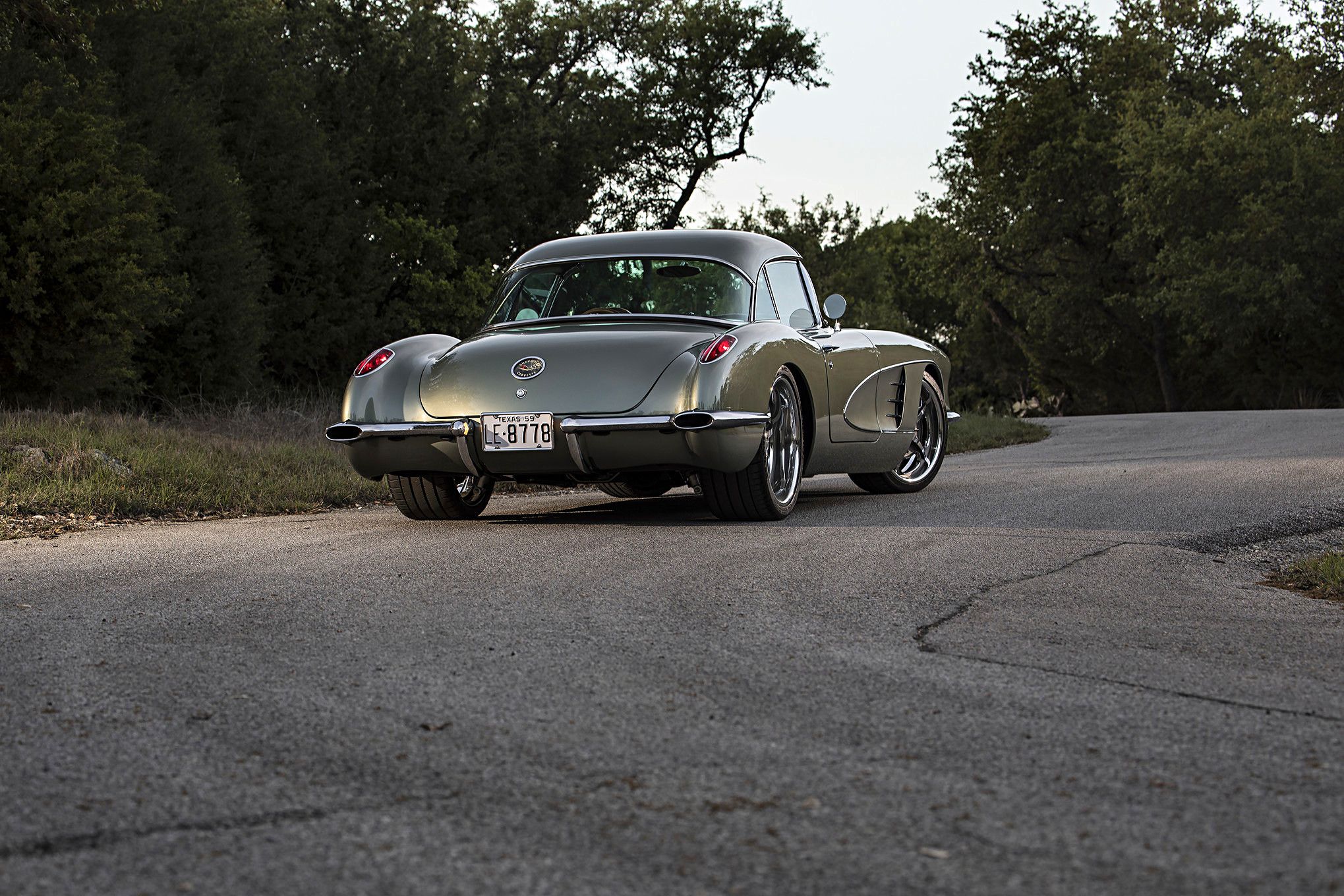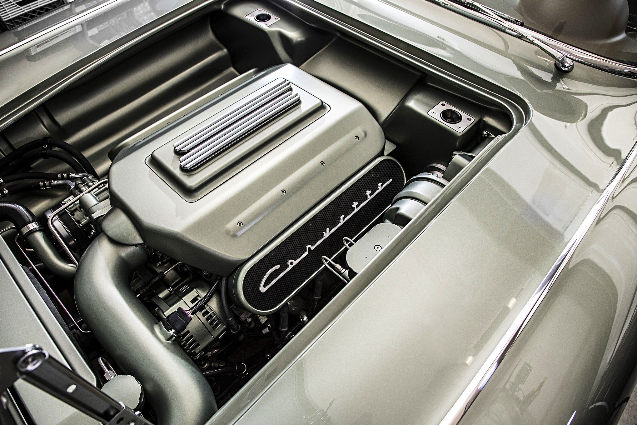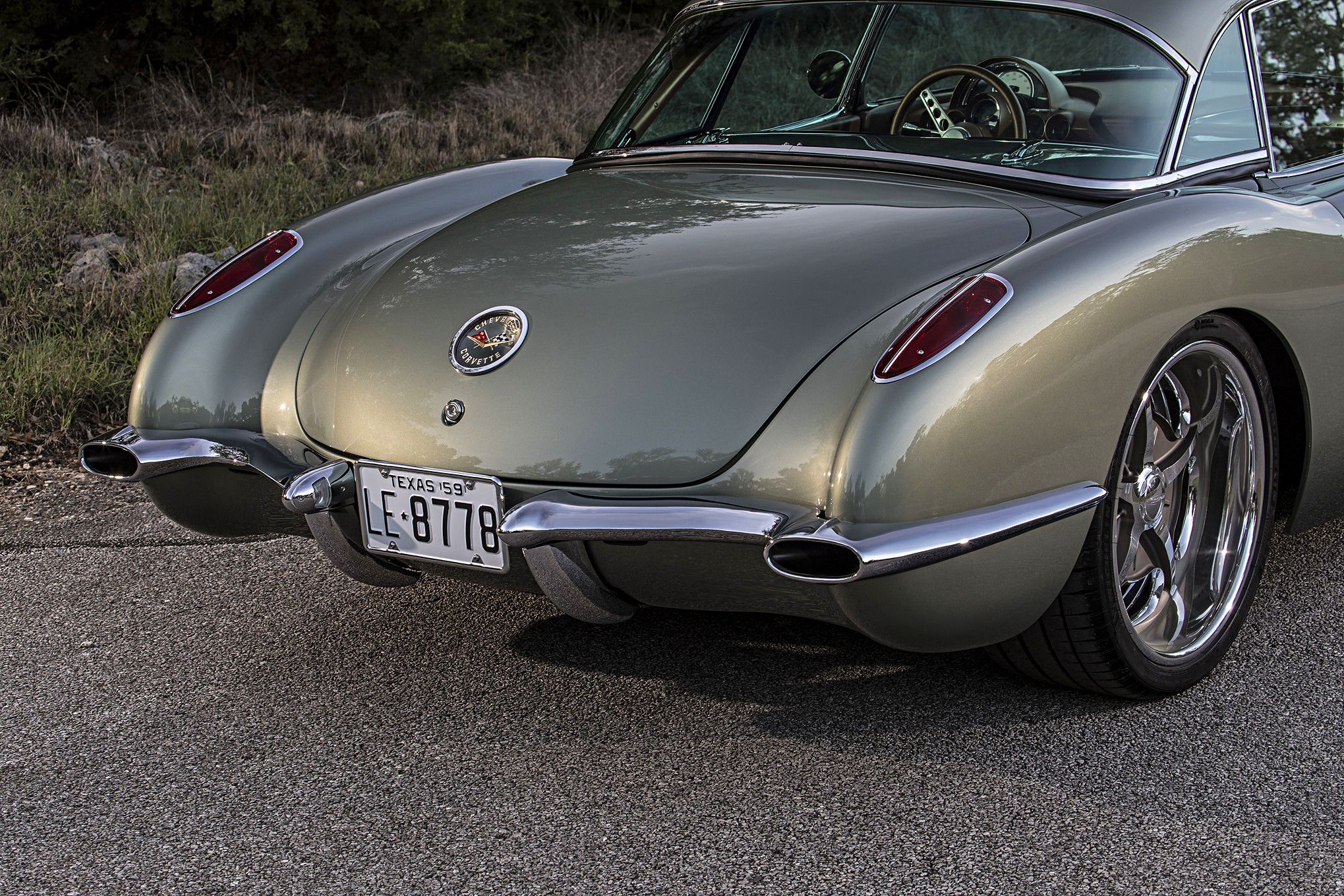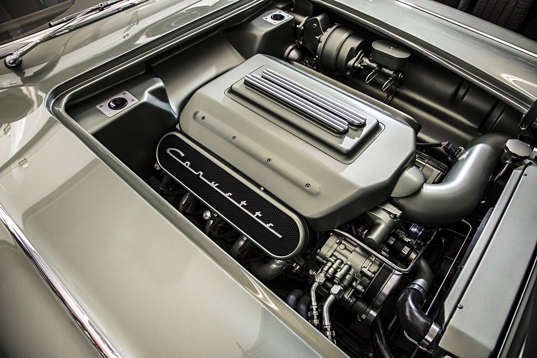 The body hasn’t changed all that much. The rear wheel wells have been tubbed, but that’s about it. The two-tone paint scheme found on C1 Corvettes is actually still there, but it’s extremely subtle. The larger part of the body was finished in a metallic shade of Silver Green Effect, while the coves got the same color in matte. It took me a couple of glances to notice that this car wasn’t straight silver, but I’ve got to say that I’m a fan. The subtle notes of green provide another classic, almost British facet to the car’s looks.