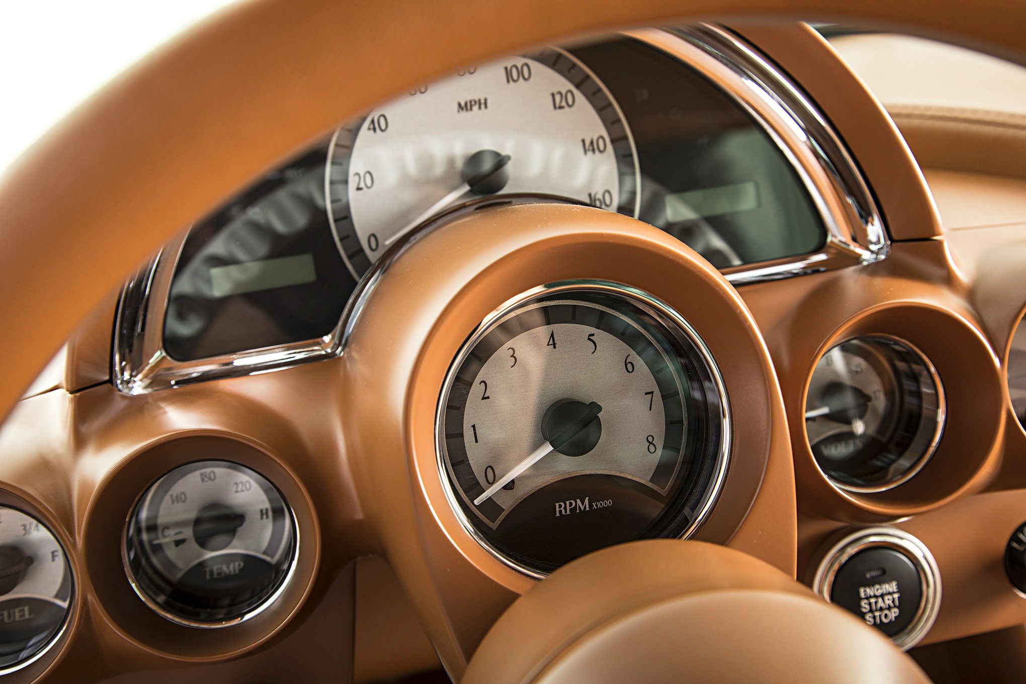The new interior could be mistaken for that of a classic Jag; it just needs a little polished wood. Almost everything has been covered in brown Ultraleather, and it looks extraordinarily comfortable for cruising. The new steering wheel is by Billet Specialties, the gauges are Dakota Digital VHXs, and a new sound system complete with a trunk-mounted Bluetooth-compatible Kicker head unit gives you the option of a soundtrack, should you get bored with the roar of the LS3. There are power windows and a push button ignition system too. It took over four years, but there’s no question that every second of work was worth it.