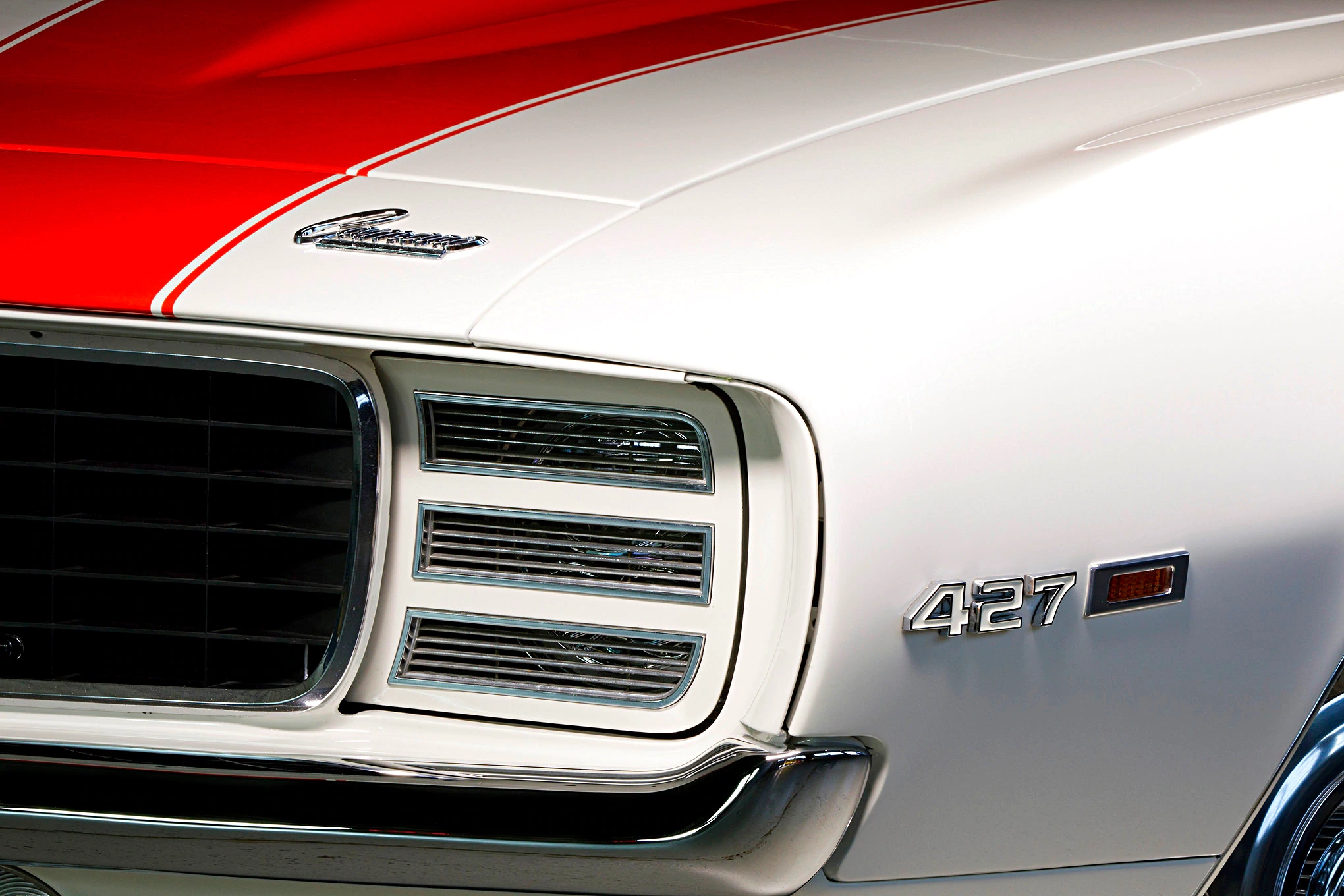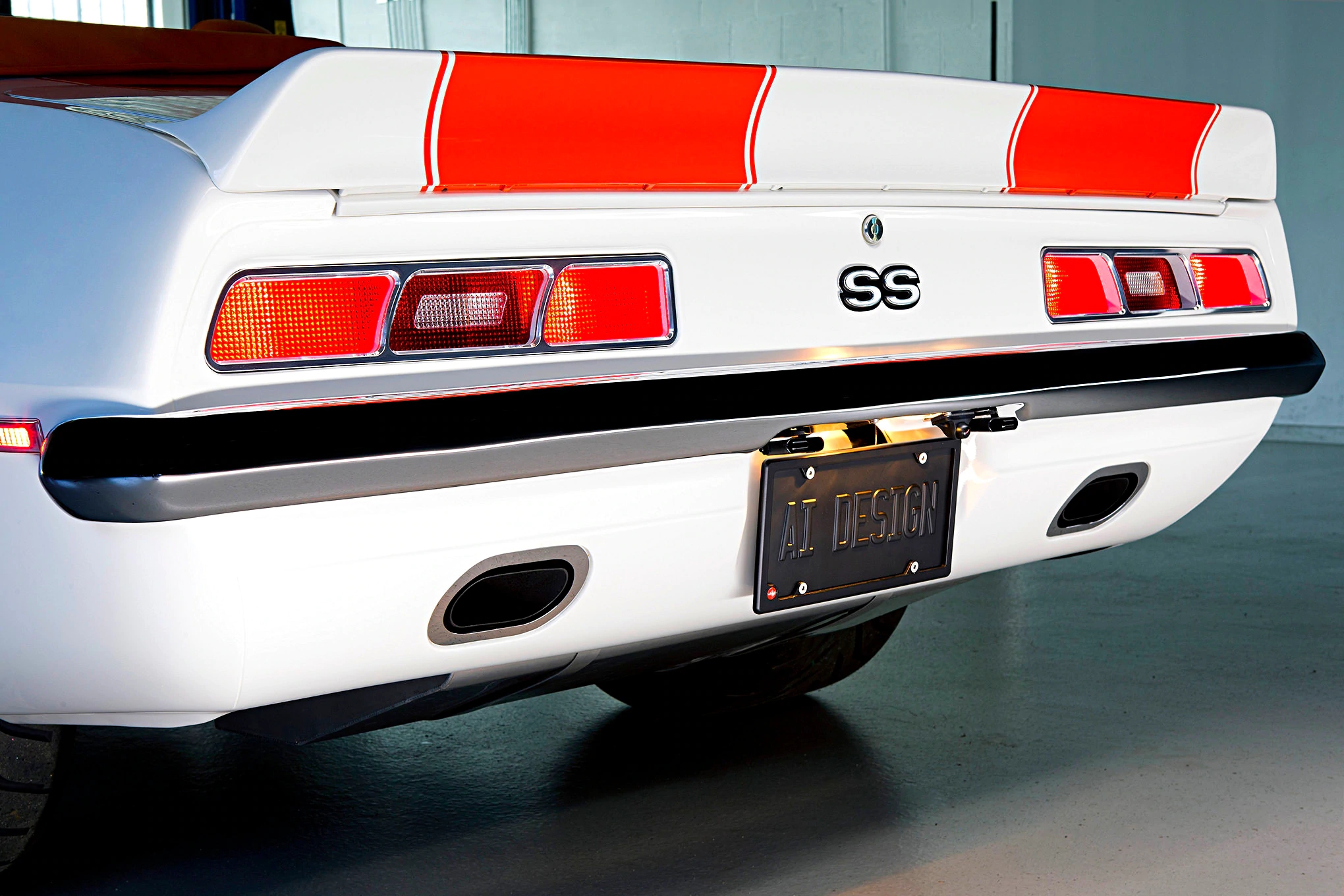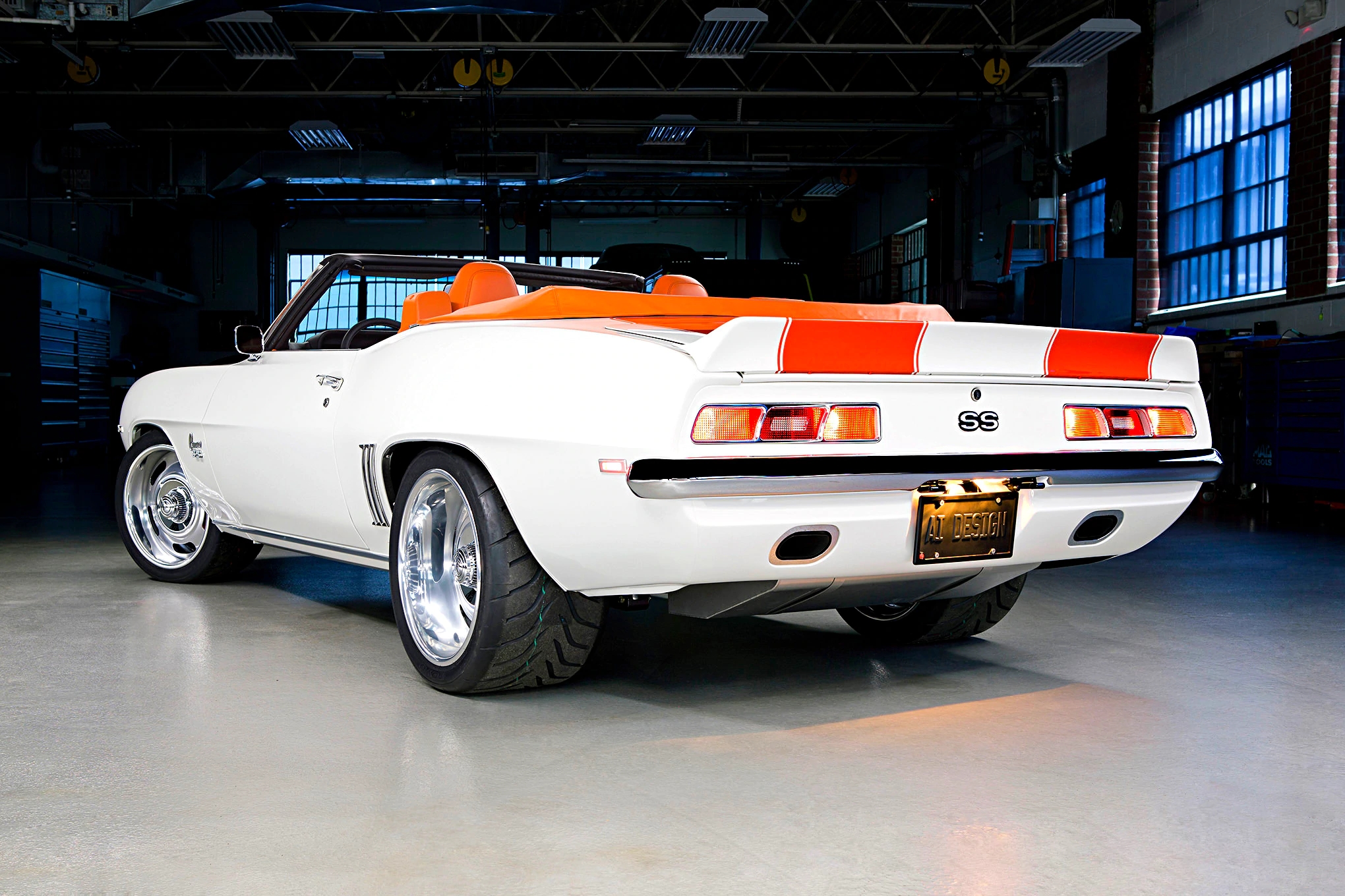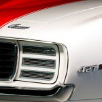 On the suspension front, the front suspension set up is a joy to behold. The car rides on Detroit Speed Engineering coilovers and a hydroformed subframe. Bolstering this set up is an anti-roll bar, while handling has been improved with new rack and pinion steering. At the back, there’s Detroit Speed Quadralink suspension, along with their Mini-Tubs, new inner wheel housings. Exhaust gases flow down a custom line, feeding out of Borla mufflers, which fit snugly into the rear valance. Wrapping around both ends of the Camaro are a pair of gorgeous tucked bumpers, finished in copper, nickel, and chrome.