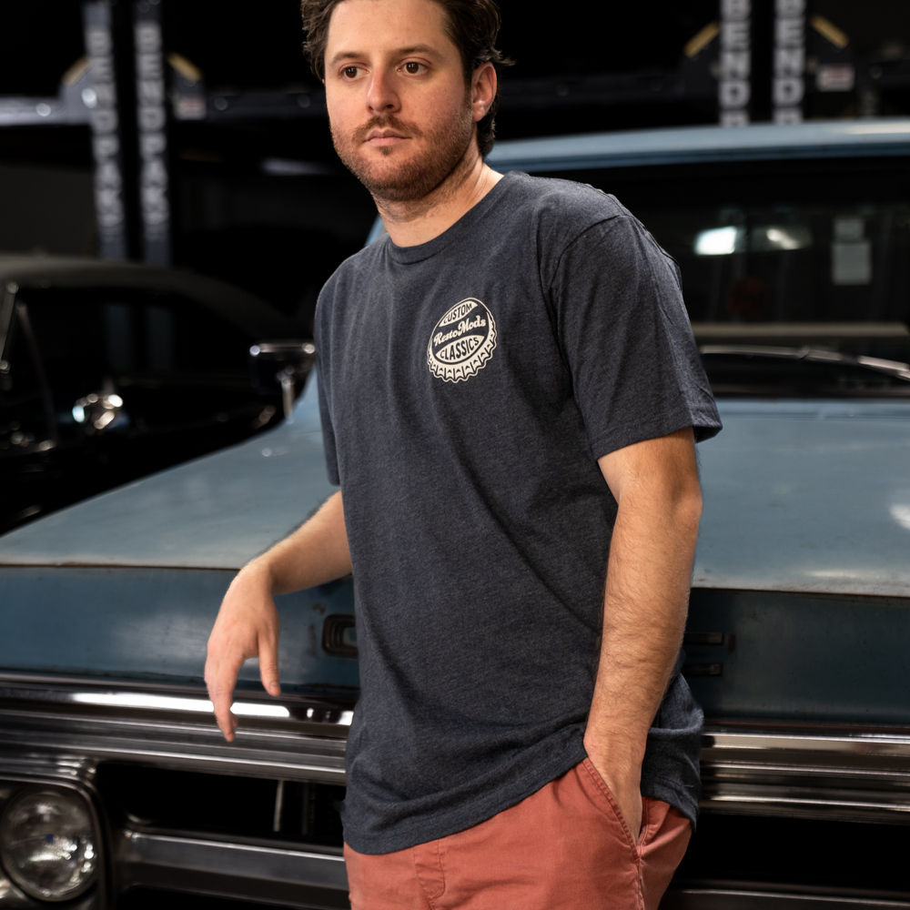 Upgrade your style with the Bottle Cap Tee. This midnight navy tee features a vintage bottle cap illustration with the RestoMods logo on the front left chest and large across the back of the shirt. Available in sizes S-3XL, this tee is crafted from a 60/40 combed ring-spun cotton and polyester sueded jersey fabric blend, offering an ultra-soft feel and relaxed fit.