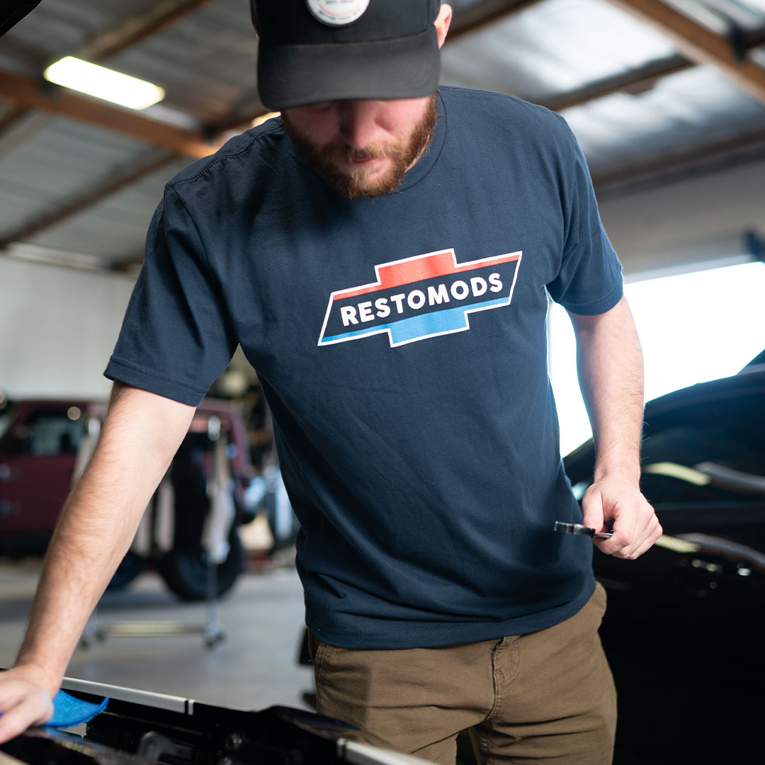 ● Iconic design: Features a striking RestoMods design on a white, red, and blue tee
