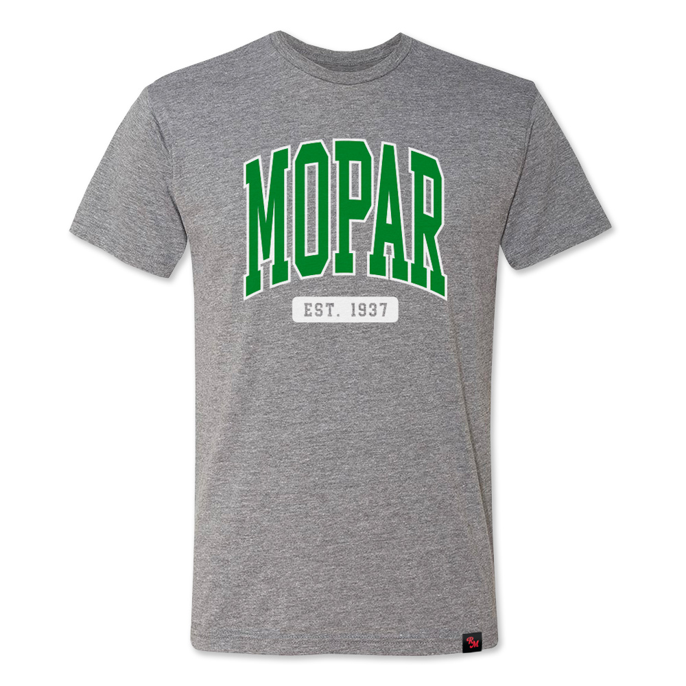It’s the classic Mopar Tee you know and love, but now as the Campus Tee in a gentleman’s green college block style script.