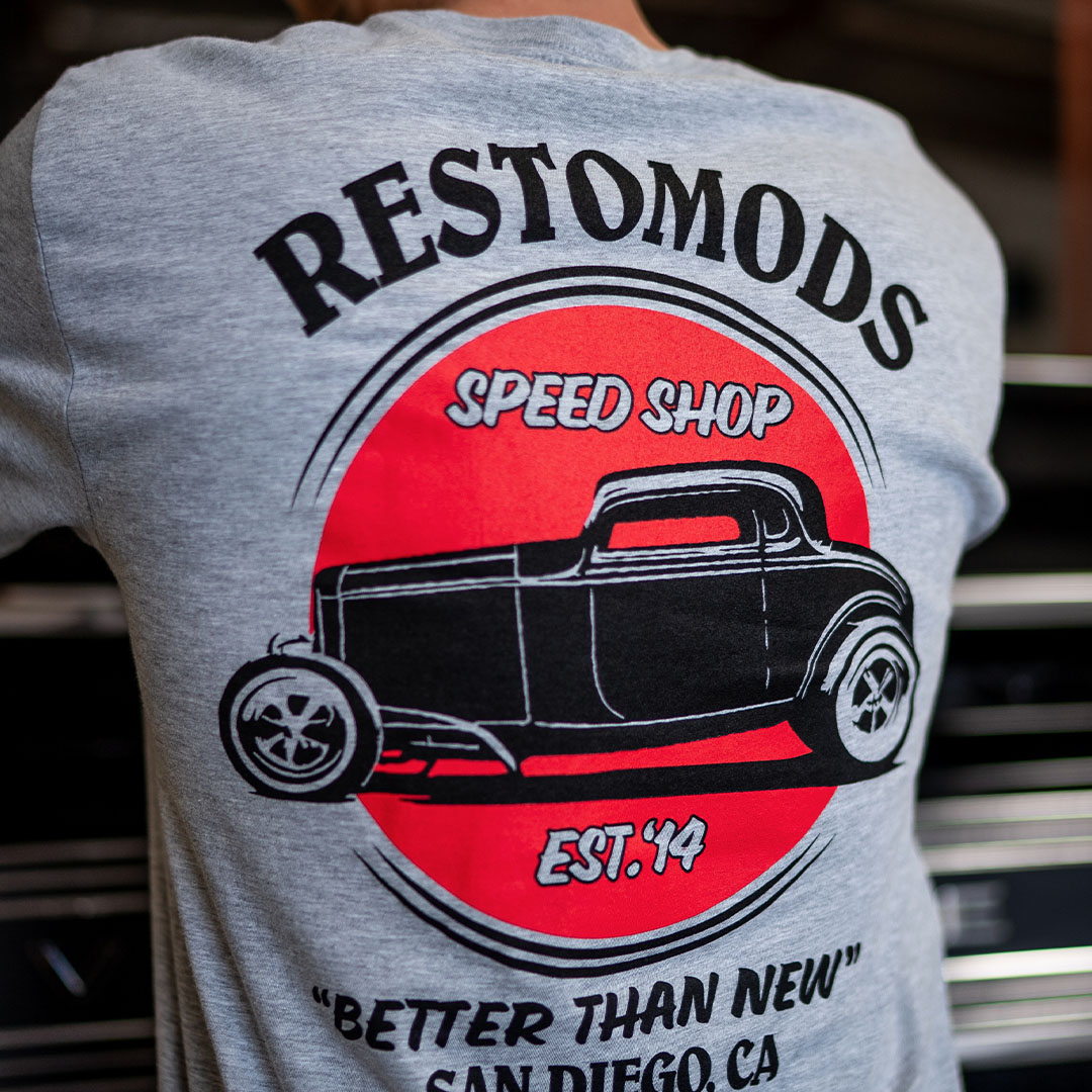 The Classic Pocket Tee invokes the spirit of Hot Rod culture in every way. What’s more is that this shirt is grey, so you don’t have to worry about one or two oil stains from wrenching on your own hot rod or restomod.
