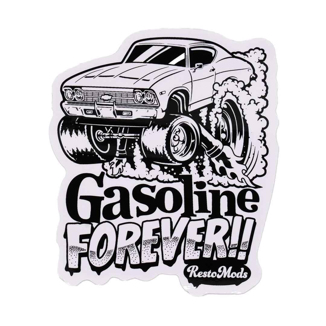 Upgrade your style with the Gasoline Sticker. This 3-inch sticker features a bold black and white cartoon illustration of a 1969 Chevelle doing a massive burnout, with the words “Gasoline Forever!” proudly displayed underneath. Made from high-quality waterproof and sunlight-proof vinyl, this sticker is perfect for indoor and outdoor use, giving your car, laptop, or garage gear a touch of muscle car attitude.