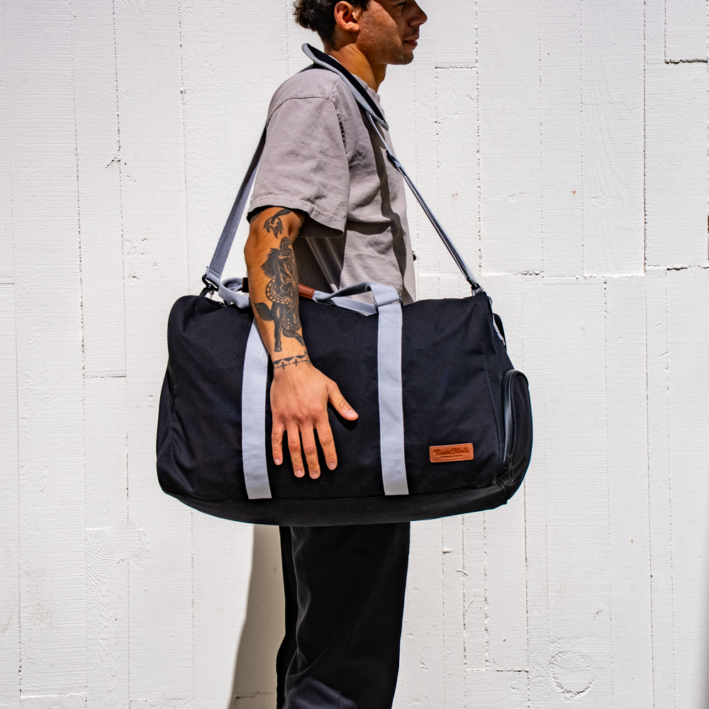 Upgrade your gear with the Speed Shop Canvas Duffle. This black duffle bag is crafted from rugged canvas and built to haul everything from gym essentials to weekend getaway gear. Featuring a sturdy leather handle and an embossed leather patch, it combines classic utility with vintage speed shop vibes.