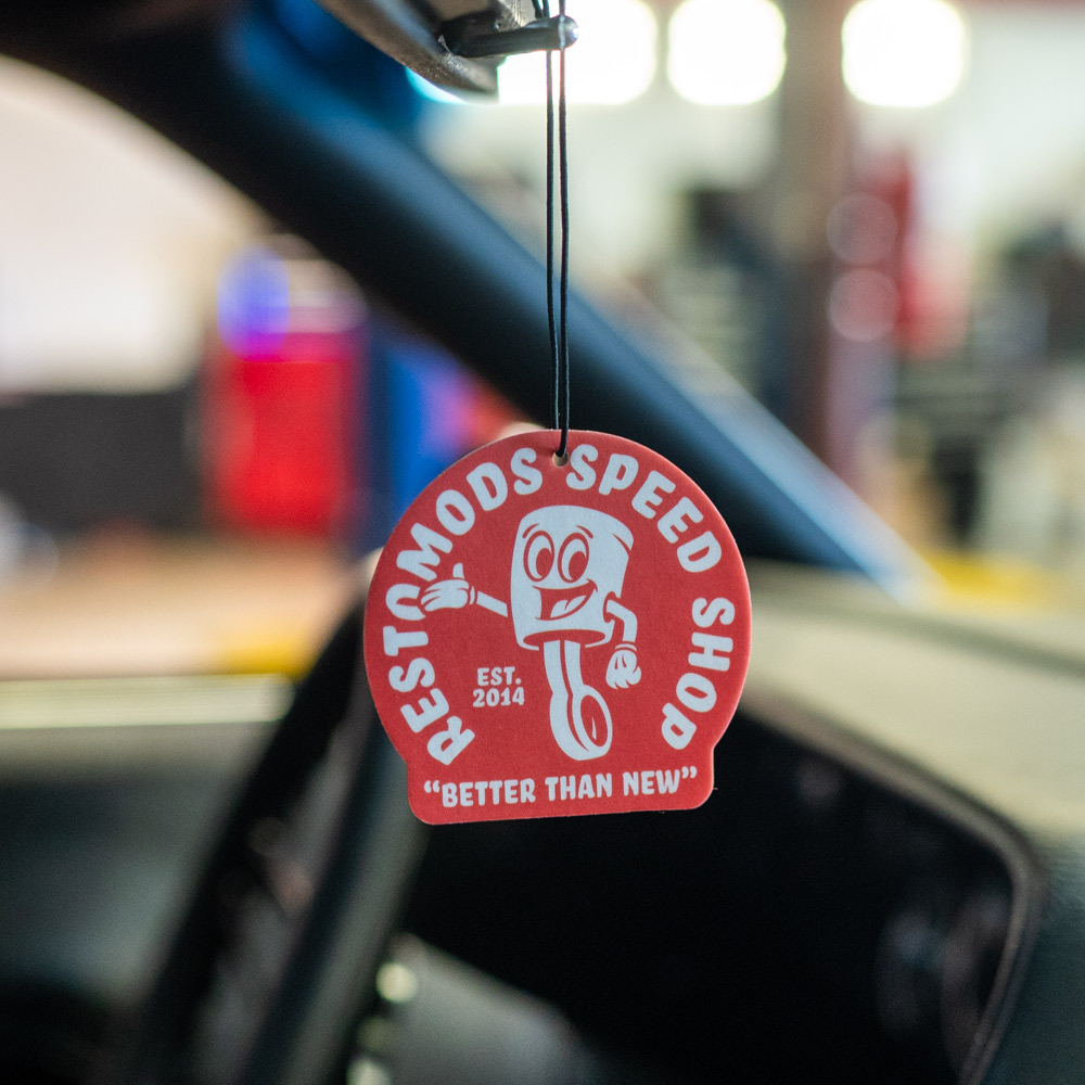 The Speedy Air Freshener will hang on your mirror to serve as a reminder that RestoMods are Better Than New. This Thyme scented air freshener is just what your car and nose need!