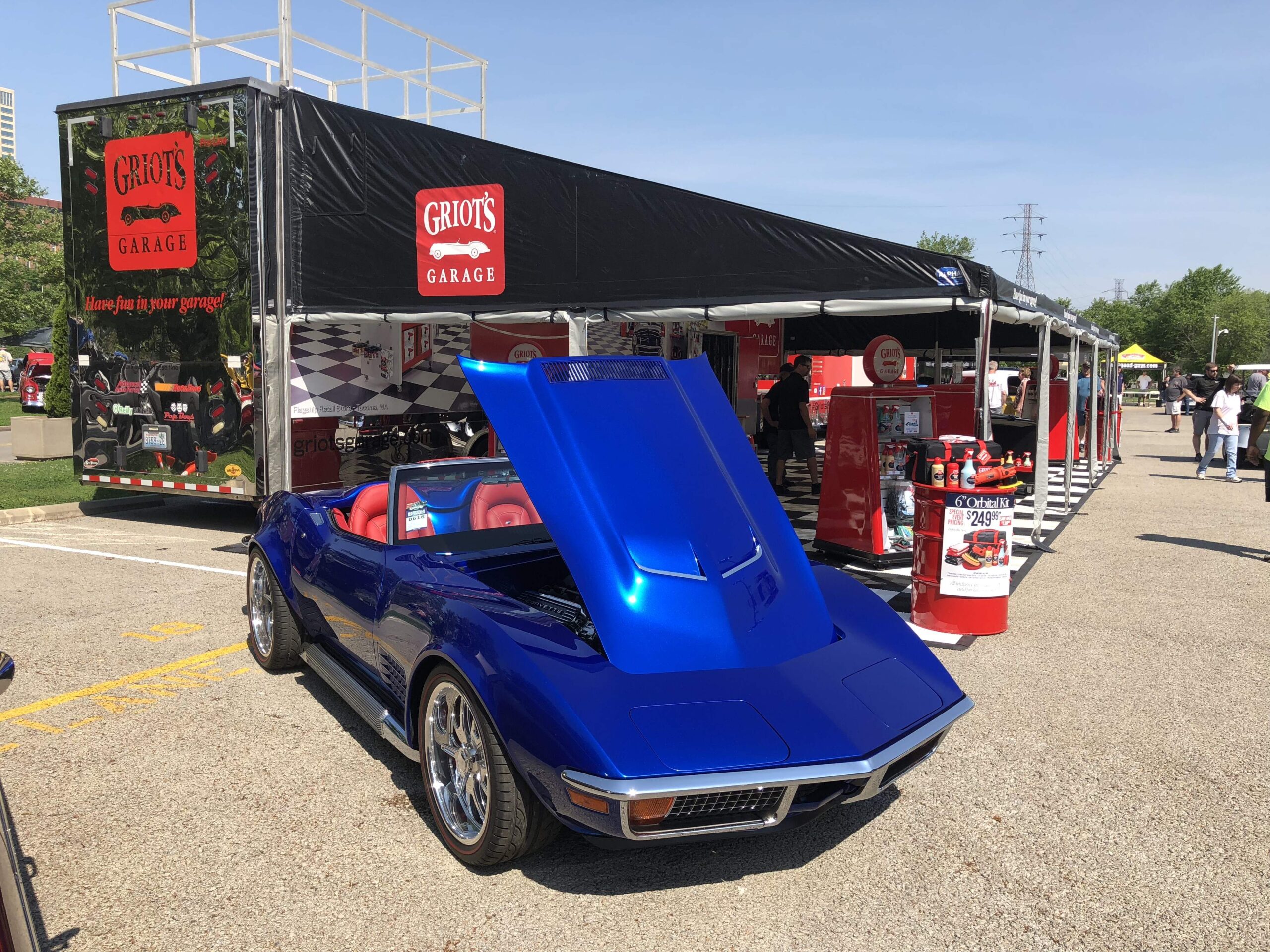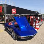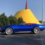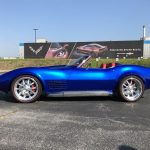 The car’s killer looks arise from a variety of tasteful exterior and interior modifications. Take the side exhaust for example, they’re still factory side pipes, but with chambered mufflers by Sweet Thunder Exhaust. Another example is the deck lid, which is done in C6 style, with waterfall. The convertible top latches have been removed, replaced with a custom buckle to hold the roof down. The rear flares are two inch customs from Custom Image Corvette. That deep blue paintjob is a custom PPG mix called “Super Blue” by Paint House Rags of Cypress, Texas, with the painting itself handled by Bruce Kuznicki of Great Lakes Restomods.