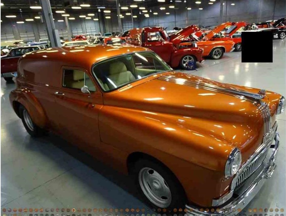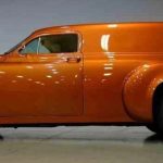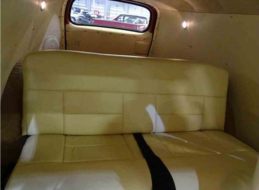 The car’s original chassis has been swapped for one from the A-body 1973 Pontiac Grand Prix. The grille comes from a ’54 Buick, and the front bumper comes from a ’47 Plymouth. Inside, the interior is finished in a catching and simple leather and neoprene. Other upgrades to the interior include a new tachometer by Pro Comp, VDO gauges, power windows, a retractable video screen, tilting steering column, and a 10-inch subwoofer. The exterior is finished in Sunburst Orange with ghost flames on the front fenders and pinstriping.