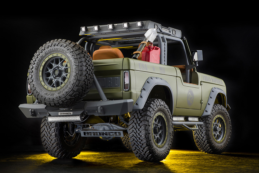 The interior goes for a functional look too, but the seating looks pretty comfy. The four seats are coated in orange leather, and fitted with webbing in the rear. Almost certainly cooler than the next-generation Bronco, this is a real wartime pinup.